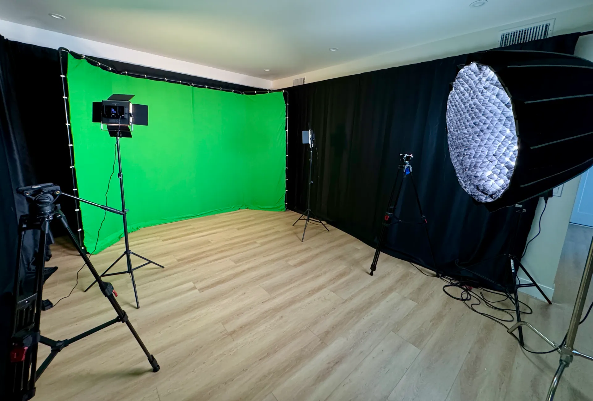 This private studio features a full-sized green screen setup with adjustable black-out curtains, perfect for seamless chroma key work in film, video, and photography projects.
