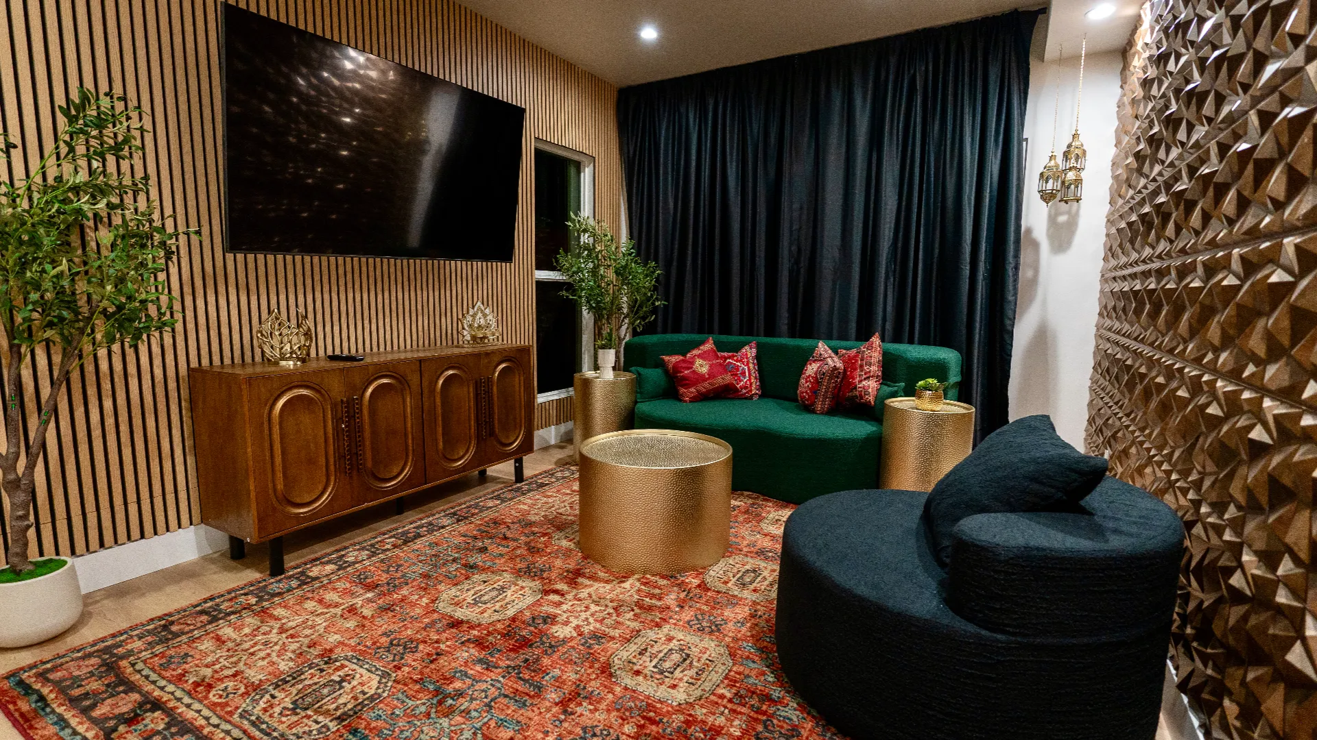 Step into a beautifully designed, spacious studio with a blend of modern and minimalist aesthetics, perfect for podcasts, photoshoots, filming, and video productions. This stunning space features.